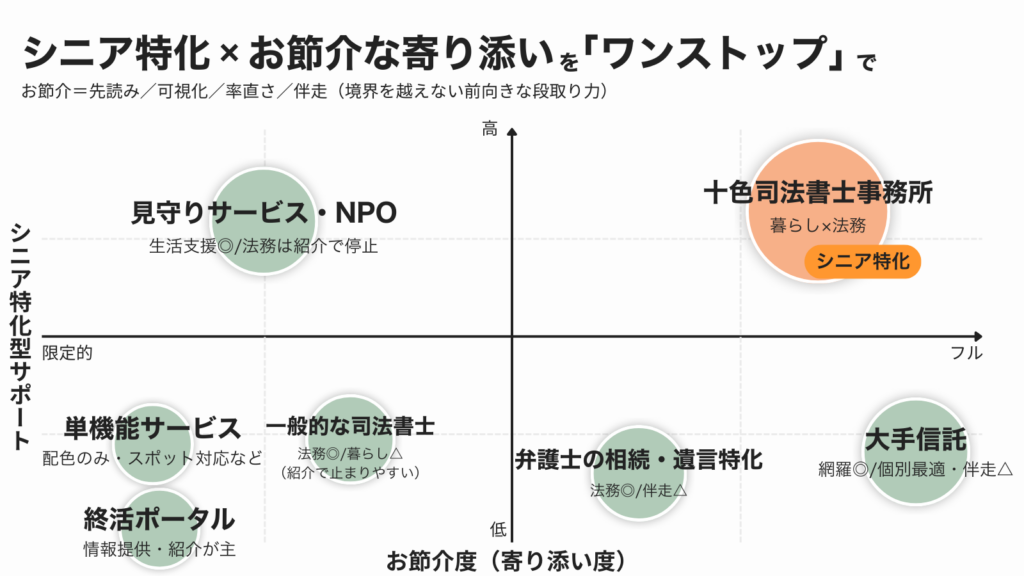 たとえば、民間事業者による見守りサービスは生活支援には強いものの、法務が必要になると他機関への紹介となり、流れが分断されがちです。